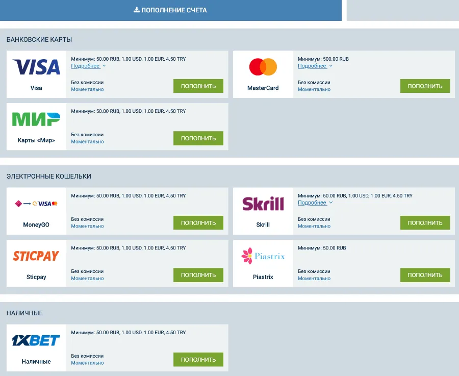 Официальный сайт 1xbet позволяет быстро обналичить сумму от 1,5 евро. При снятии средств не взимается комиссия. Поступление средств происходит в полном объеме.
